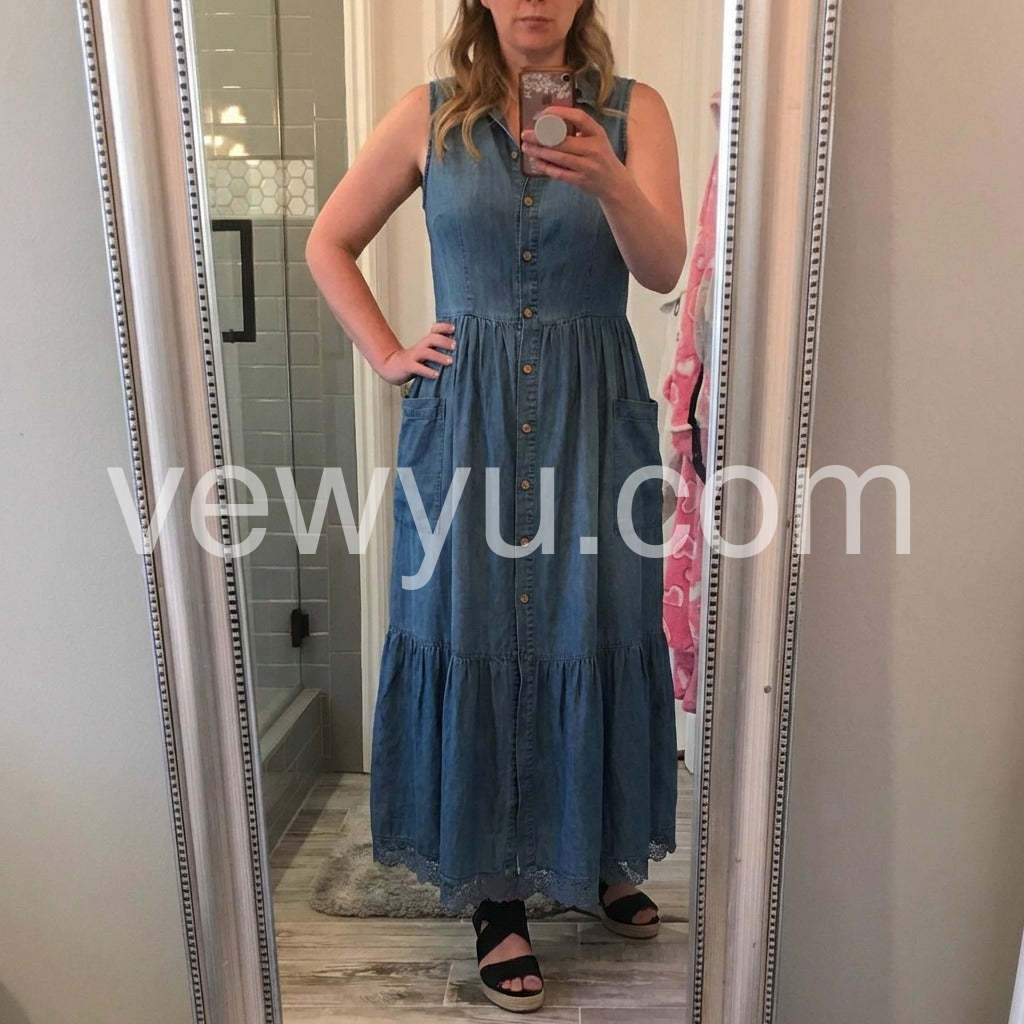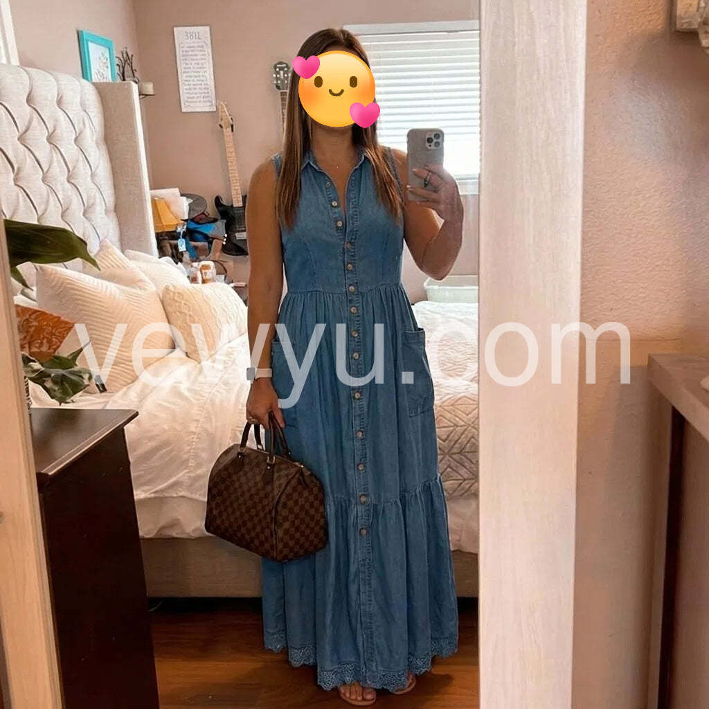 Crafted from premium denim, this sleeveless maxi dress combines timeless style with modern versatility. The flattering V-neckline and button-front closure create a refined silhouette that transitions effortlessly from casual daytime wear to evening occasions. The full-length cut offers elegant coverage while the structured denim fabric ensures durability and shape retention. Perfect for layering with jackets or cardigans, this wardrobe essential delivers both comfort and sophisticated appeal.