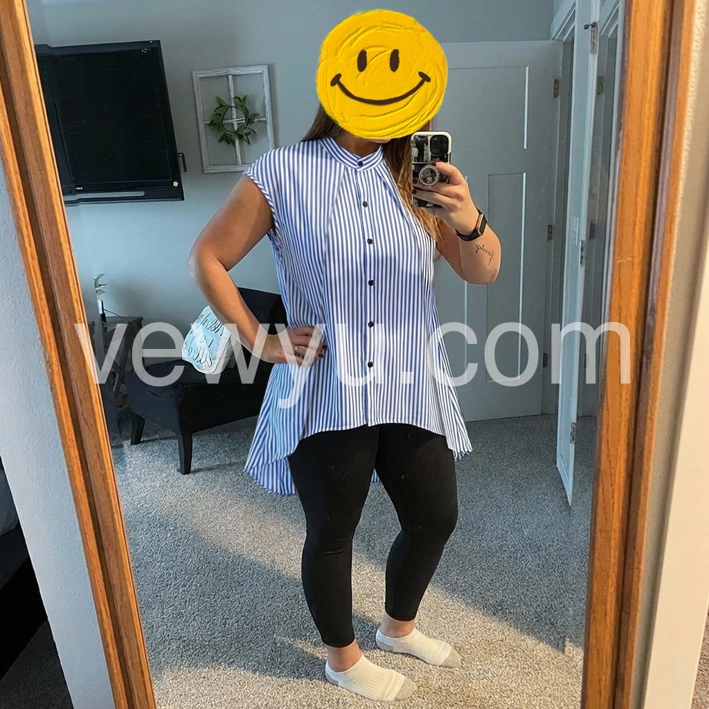 I love the dramatic high-low hem on this blouse. It covers my bum perfectly when I wear leggings, and the vertical stripes are very slimming. Highly recommend!