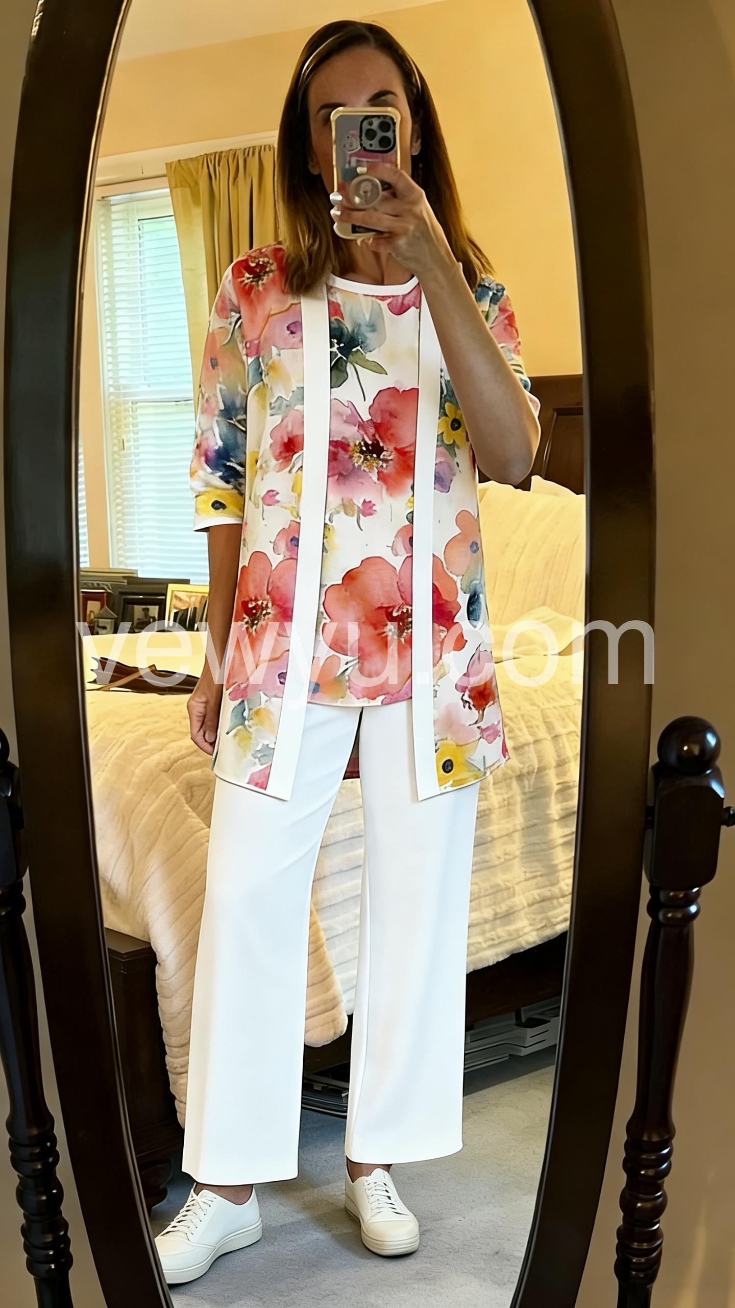 Absolutely love this two-piece set! The watercolor floral print is so vibrant and perfect for spring. The material is lightweight and breathable. I paired it with white dress pants just like the picture and received so many compliments at brunch.