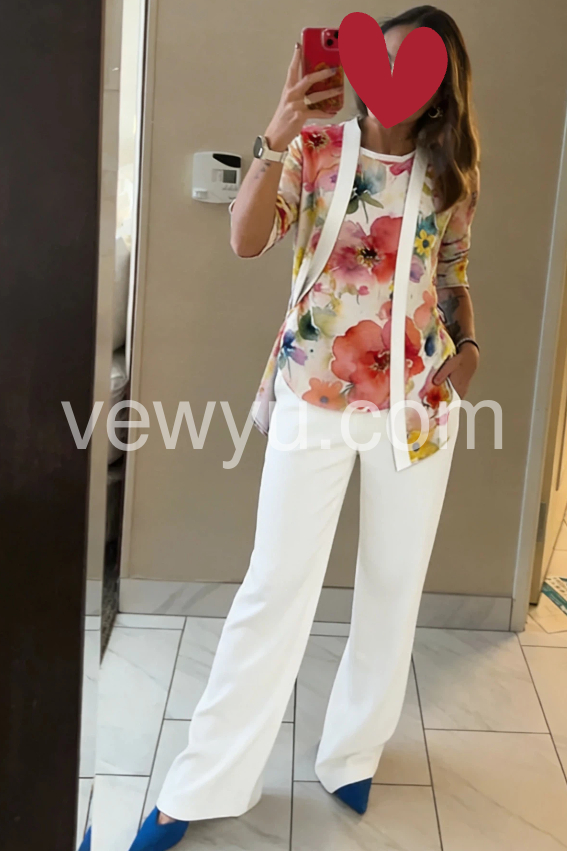 This three-piece set features a vibrant floral top and matching cardigan with white wide-leg pants. The relaxed fit offers comfort and elegance. Perfect for spring or summer occasions. Lightweight fabric ideal for casual outings. Effortlessly chic and coordinated.