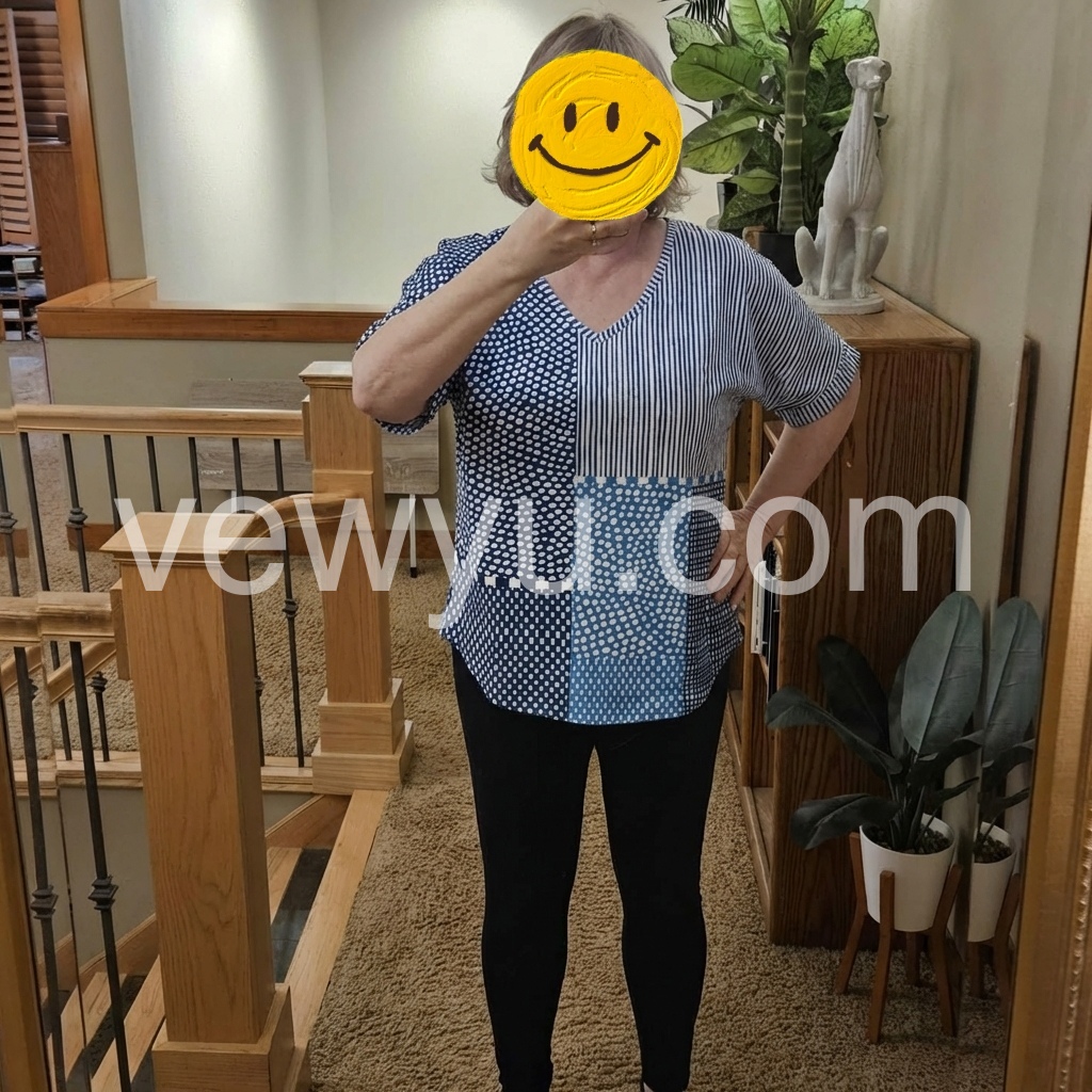 This blouse is exactly what I was looking for. The V-neck is flattering without being too deep, and the loose fit drapes beautifully, hiding my little tummy perfectly. The material is lightweight and breathable. Highly recommend!