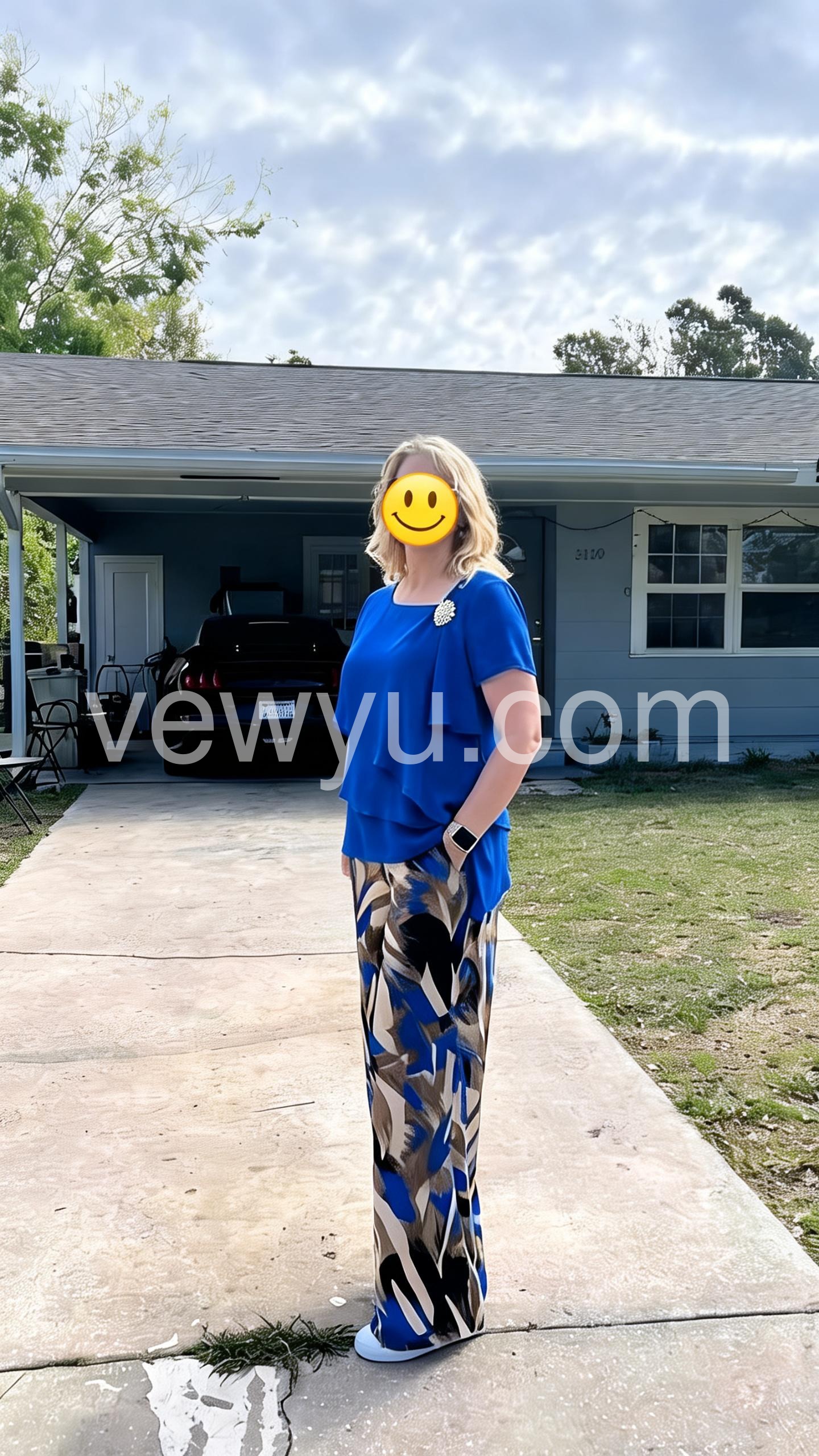 This coordinated set features a vibrant blue top with an asymmetrical layered hem and matching wide-leg pants in a bold abstract print. The combination of solid and patterned pieces creates a stylish contrast. Lightweight fabric perfect for warm weather. Ideal for casual outings or relaxed elegance. Effortlessly chic and fashion-forward.