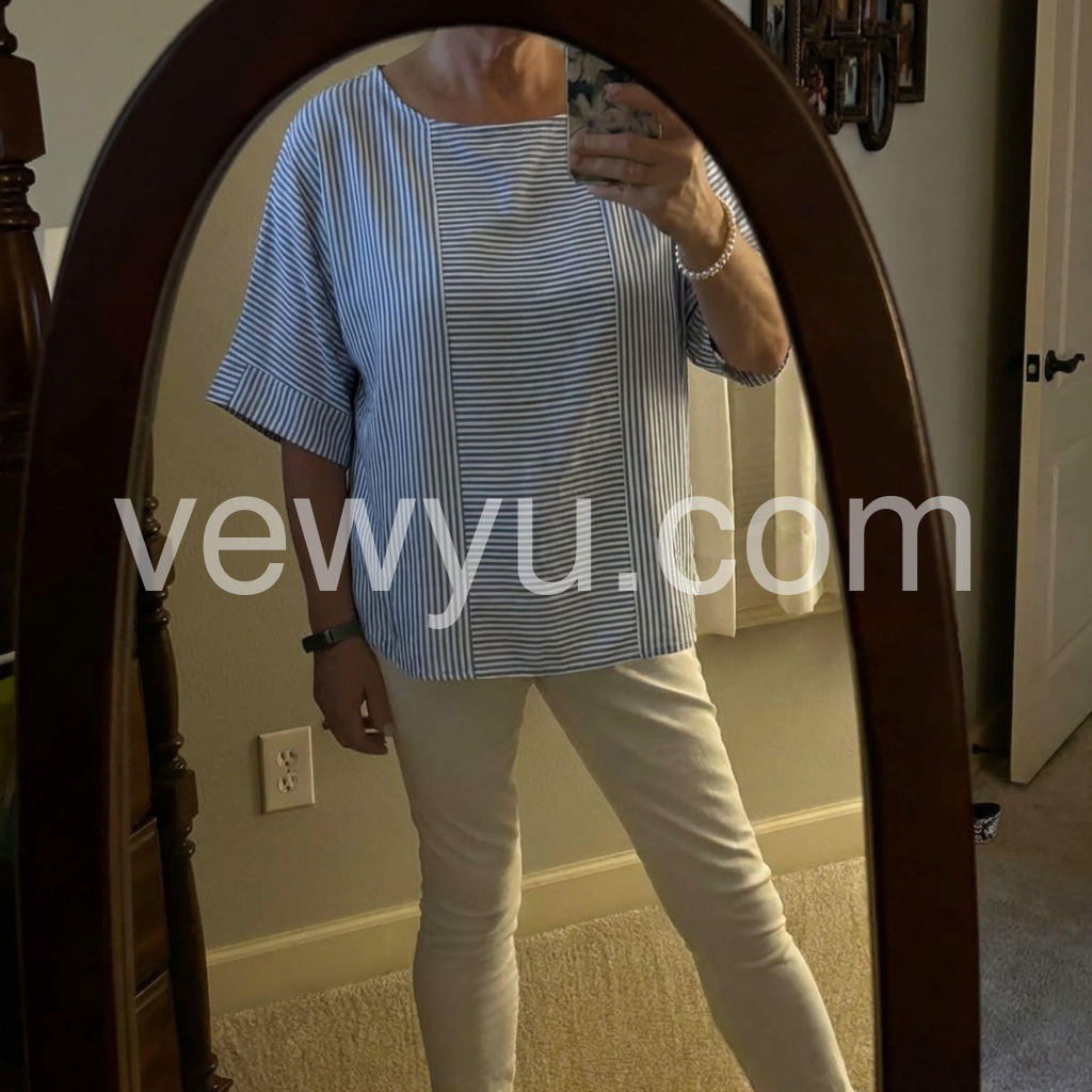I created this blouse to solve the "boring striped top" pain point. The batwing sleeves hide arm fat, while the vertical stripe panel slims the torso, creating a flattering silhouette.