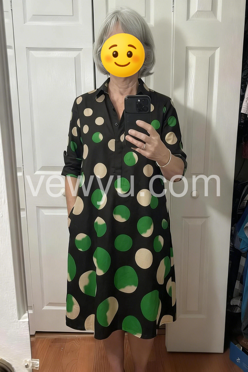 Black Green Polka Dot Shirt Collar Midi Dress
