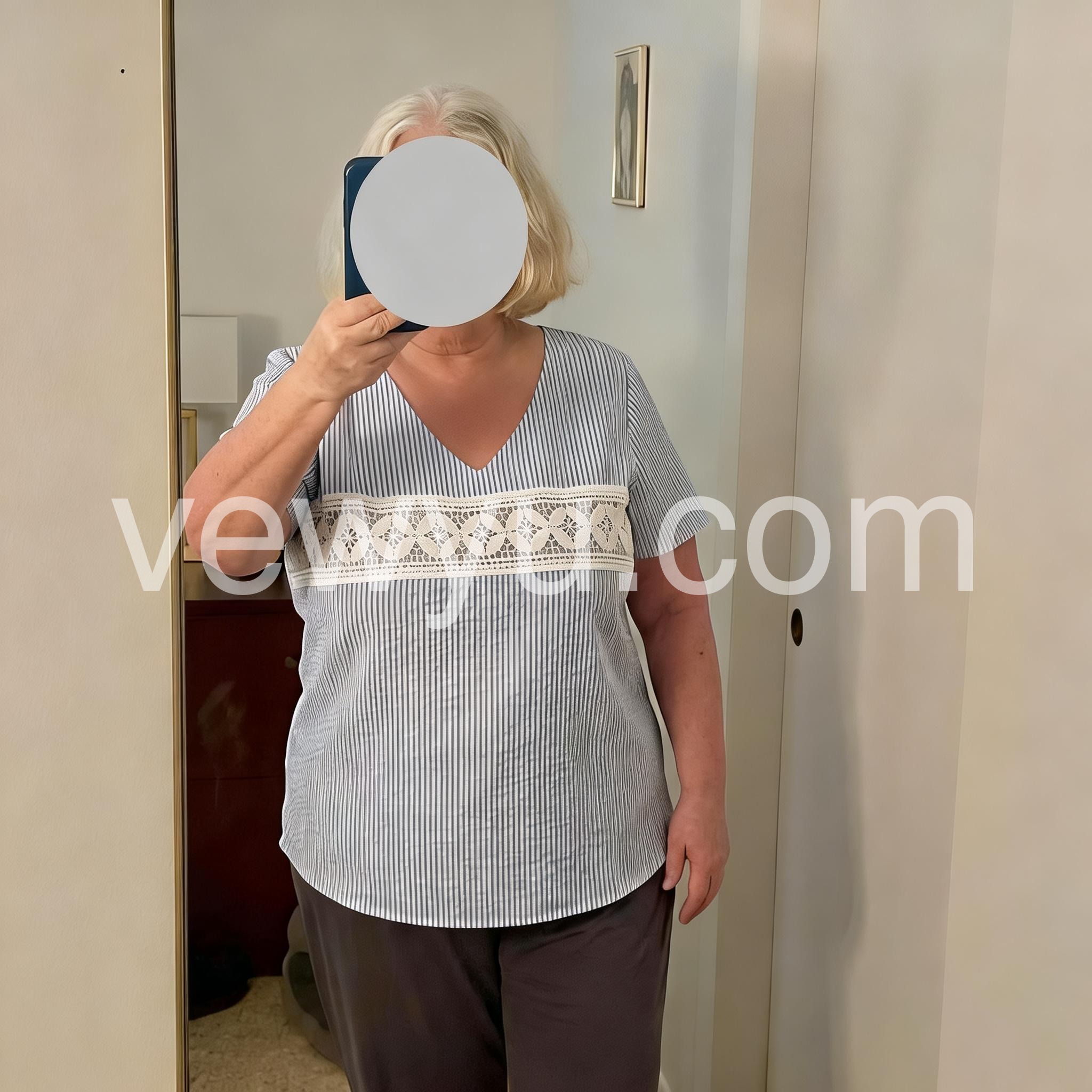 This relaxed-fit tee features light blue and white vertical stripes. A decorative white lace panel adds a delicate touch across the chest. Deep V-neckline and short sleeves for comfort. Lightweight fabric perfect for warm weather. Ideal for casual wear or beach outings.