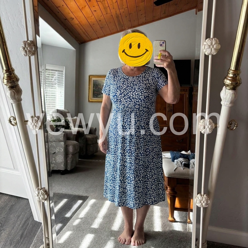 Absolutely love this dress! The blue and white floral pattern is so pretty in person. It fits perfectly and the material is very lightweight and breathable, making it perfect for summer. I wore it to a brunch and got so many compliments.
