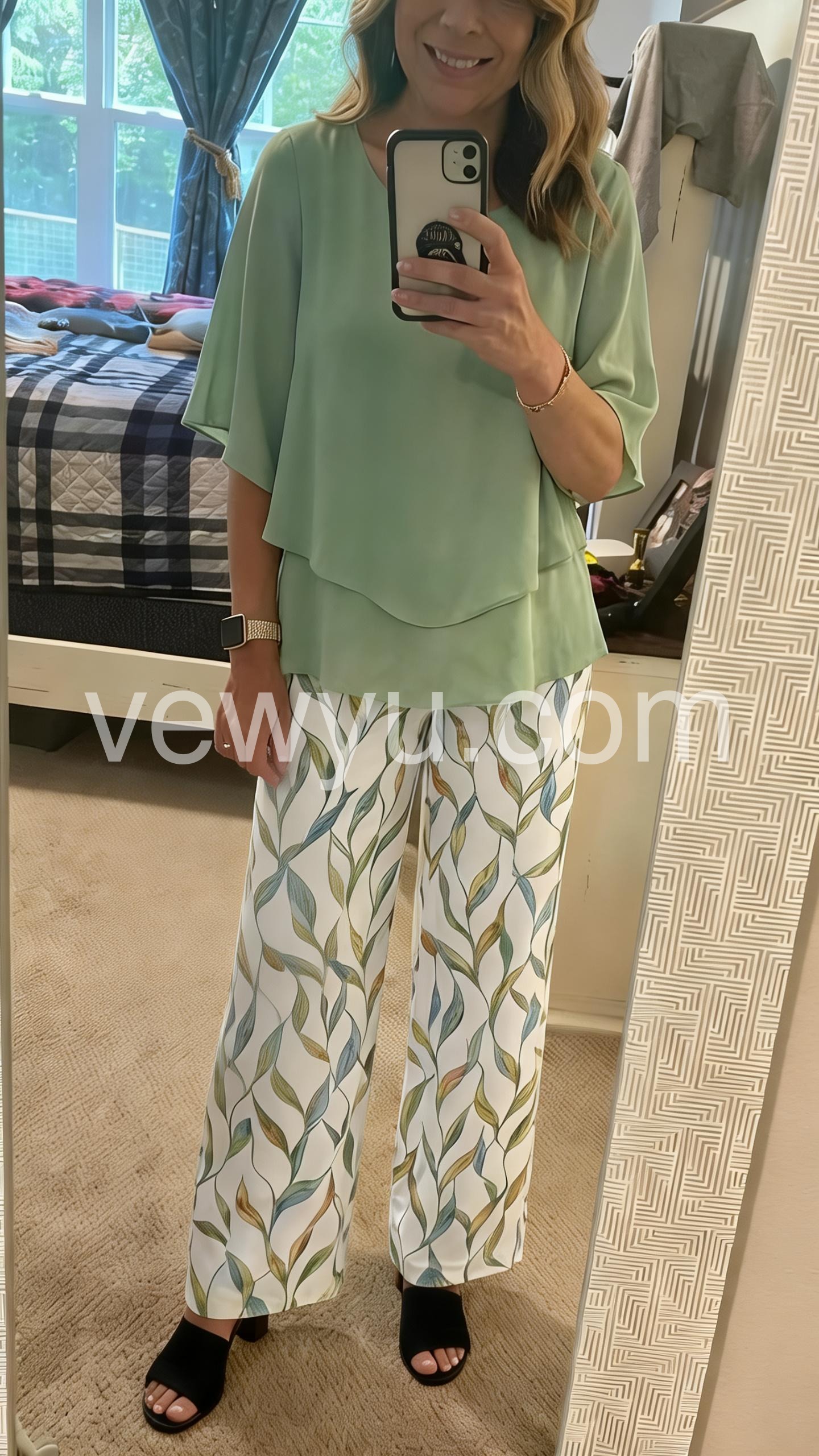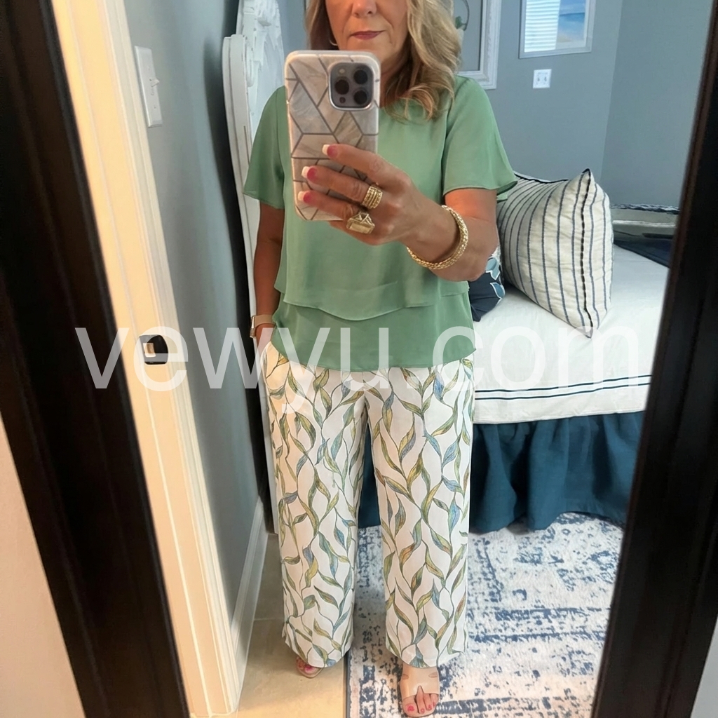 This two-piece outfit features a flowy green layered top with batwing sleeves. Paired with wide-leg pants in a soft leaf print. Lightweight and breathable fabric for all-day comfort. Perfect for casual outings or stylish everyday wear. Effortlessly chic and flattering.