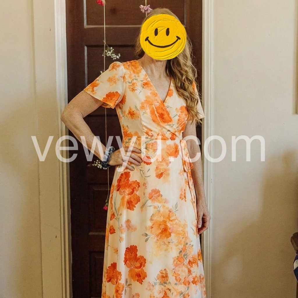 Orange Floral V-Neck Wrap Midi Dress