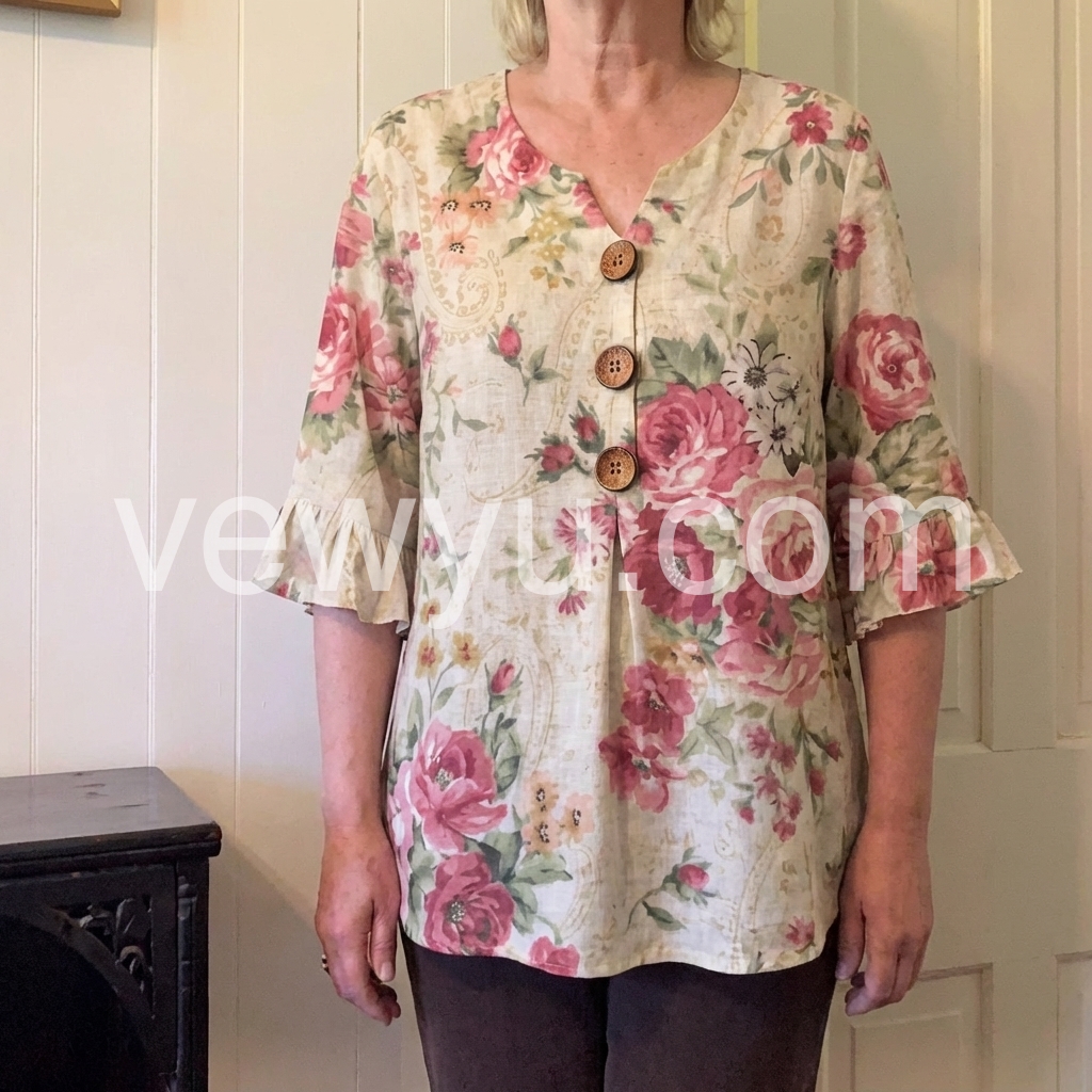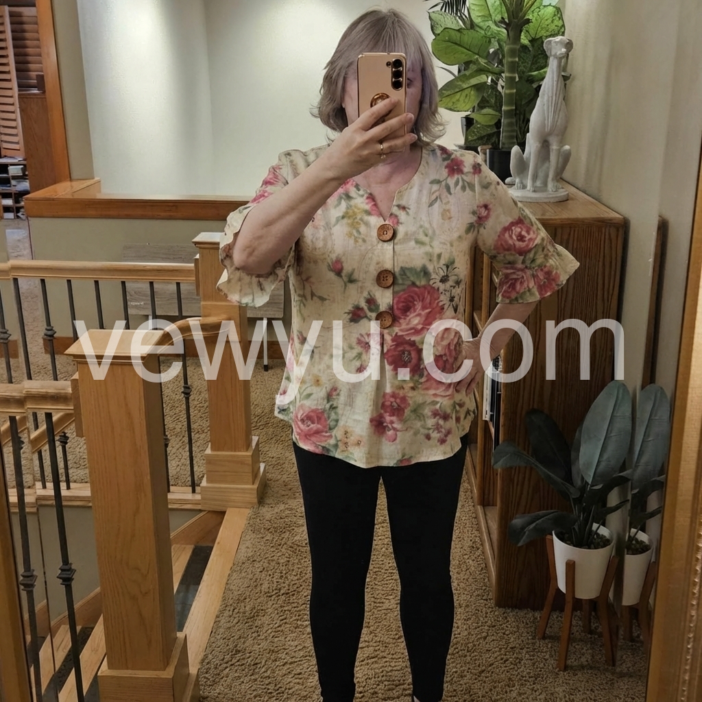 I absolutely love the floral pattern on this top! The material feels lightweight and breathable, making it perfect for spring and summer. It pairs beautifully with my favorite jeans.