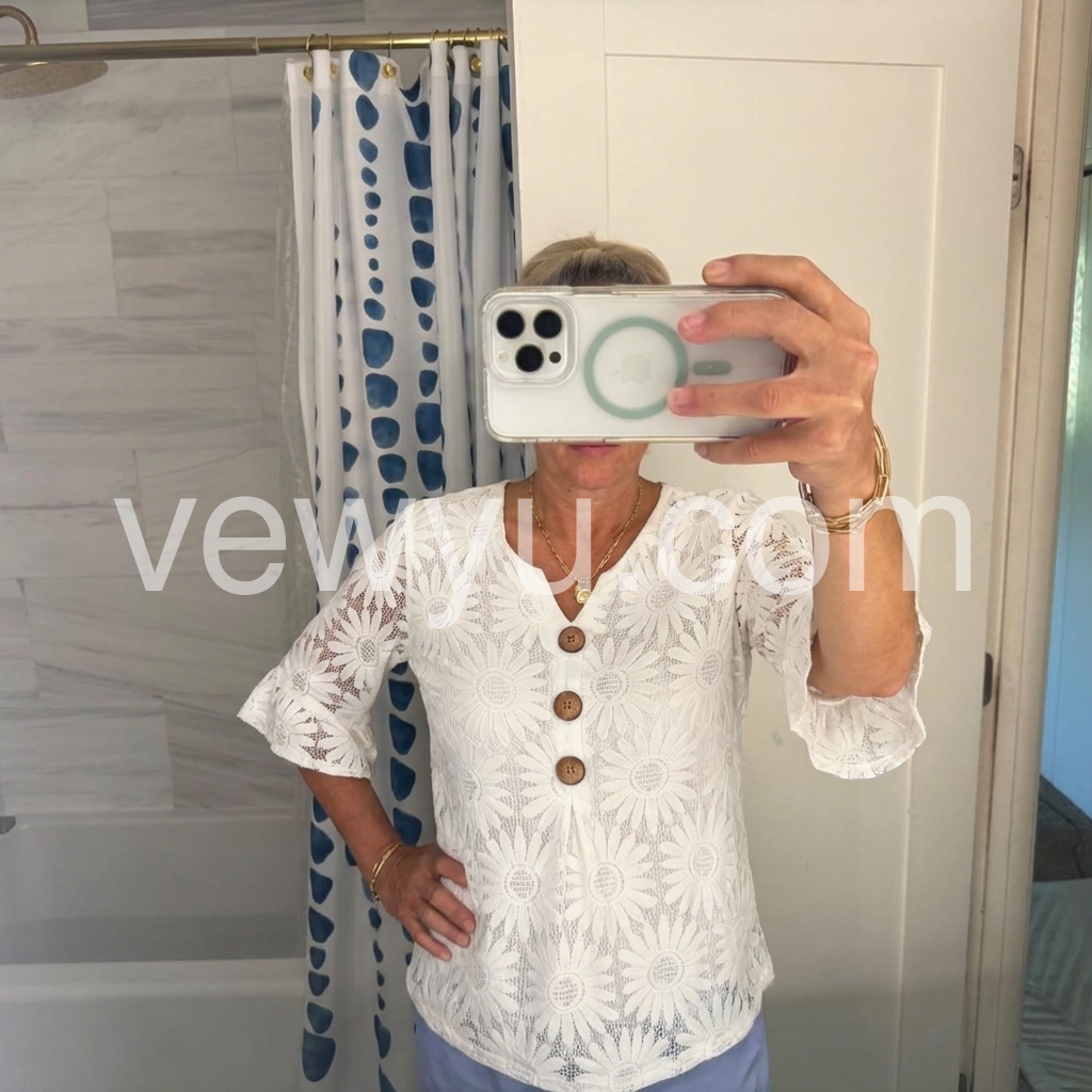 The V-neckline, three wooden accent buttons, and flared ruffle cuffs add refined, vintage-inspired detail, while the relaxed fit ensures all-day comfort.