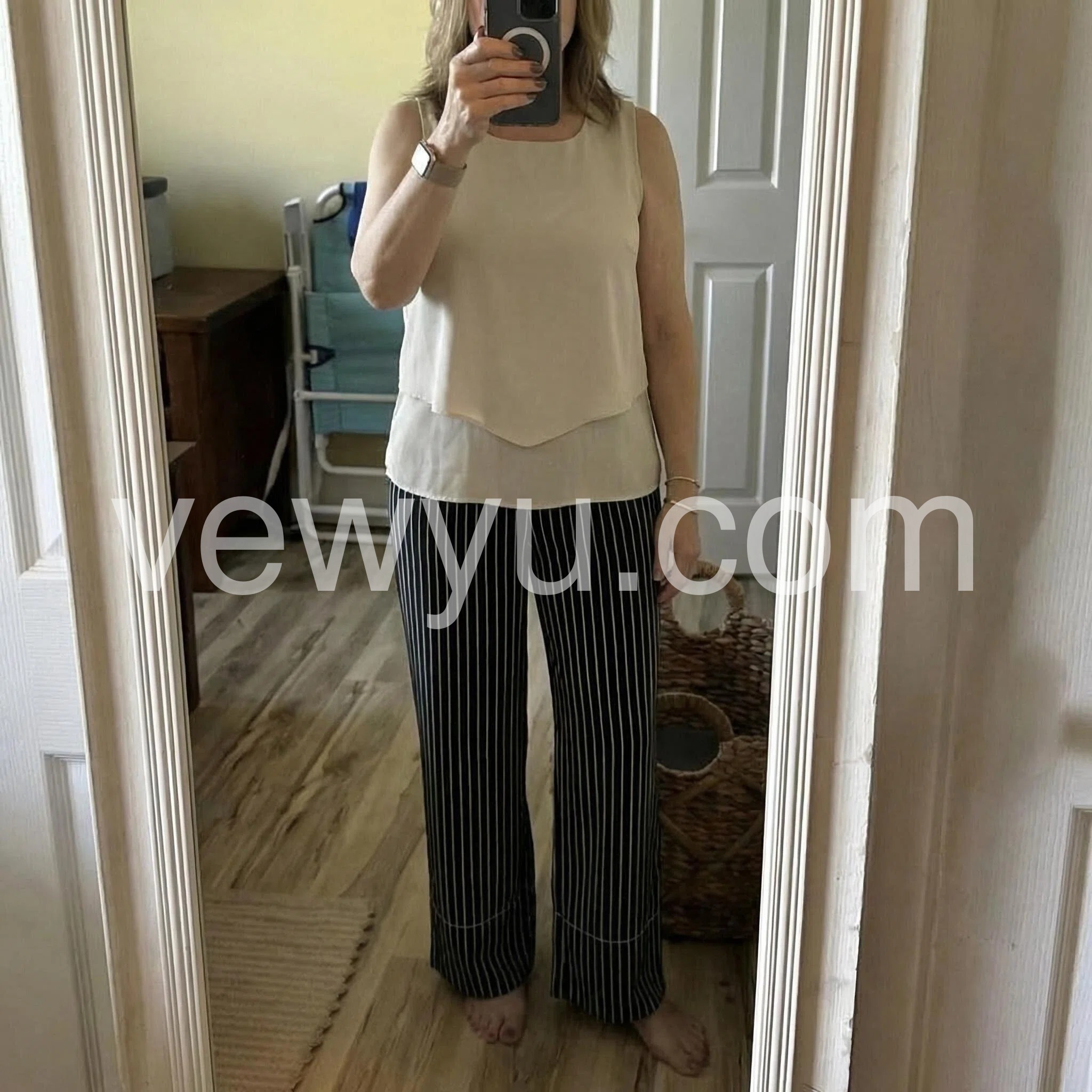 This two-piece set features a sleeveless beige top with a layered hem and square neckline. Paired with high-waisted black wide-leg pants in thin white stripes. Comfortable fit with a chic, relaxed silhouette. Perfect for casual outings or smart-casual events. Effortlessly stylish and easy to wear.
