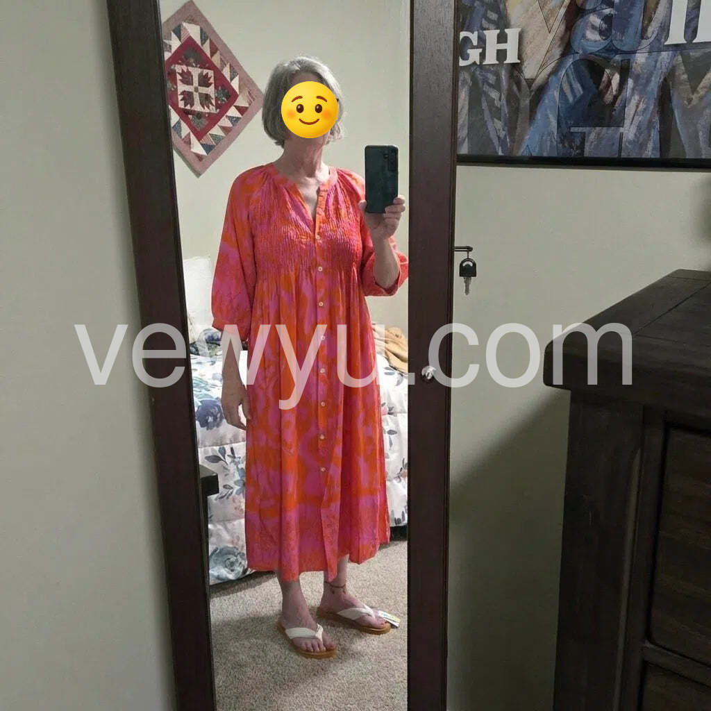 Absolutely love the vibrant pink and orange colors! It is so bright and perfect for summer. The fit is flowy and very comfortable.
