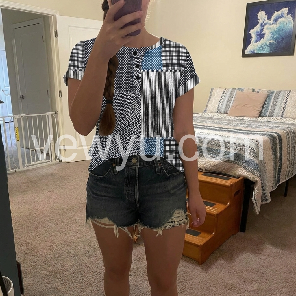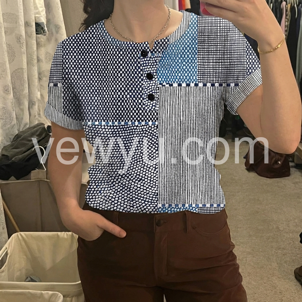 I absolutely love the patchwork design on this top! It is so unique with the mix of stripes and polka dots. The fit is true to size and very flattering. Perfect for casual Fridays at work or a weekend outing.