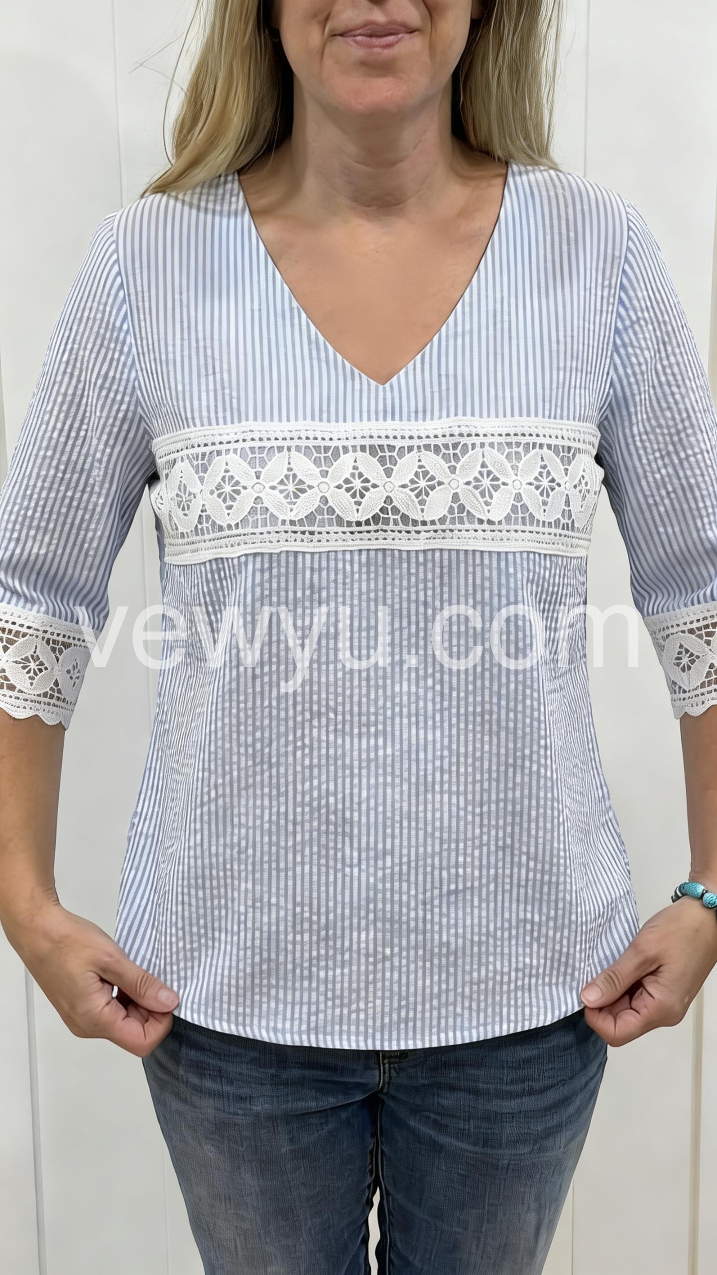 This relaxed-fit top features soft blue and white stripes with delicate lace detailing across the chest and sleeves. V-neckline and three-quarter sleeves for a comfortable fit. Lightweight fabric perfect for warm days. Effortlessly stylish with a touch of bohemian charm. Ideal for casual wear or beach outings.