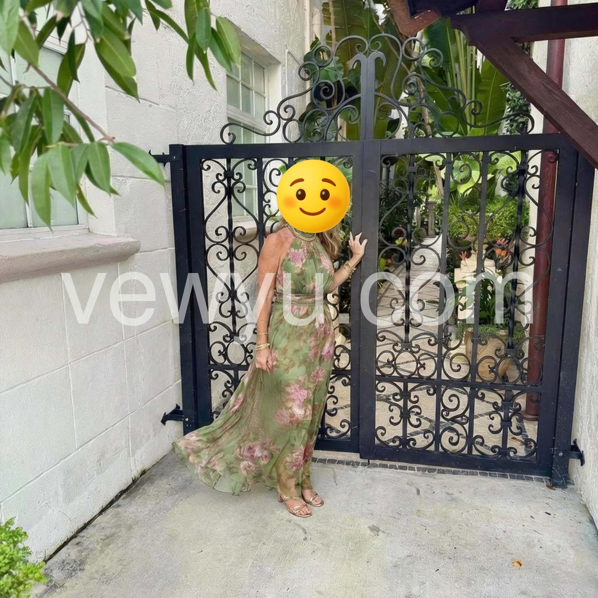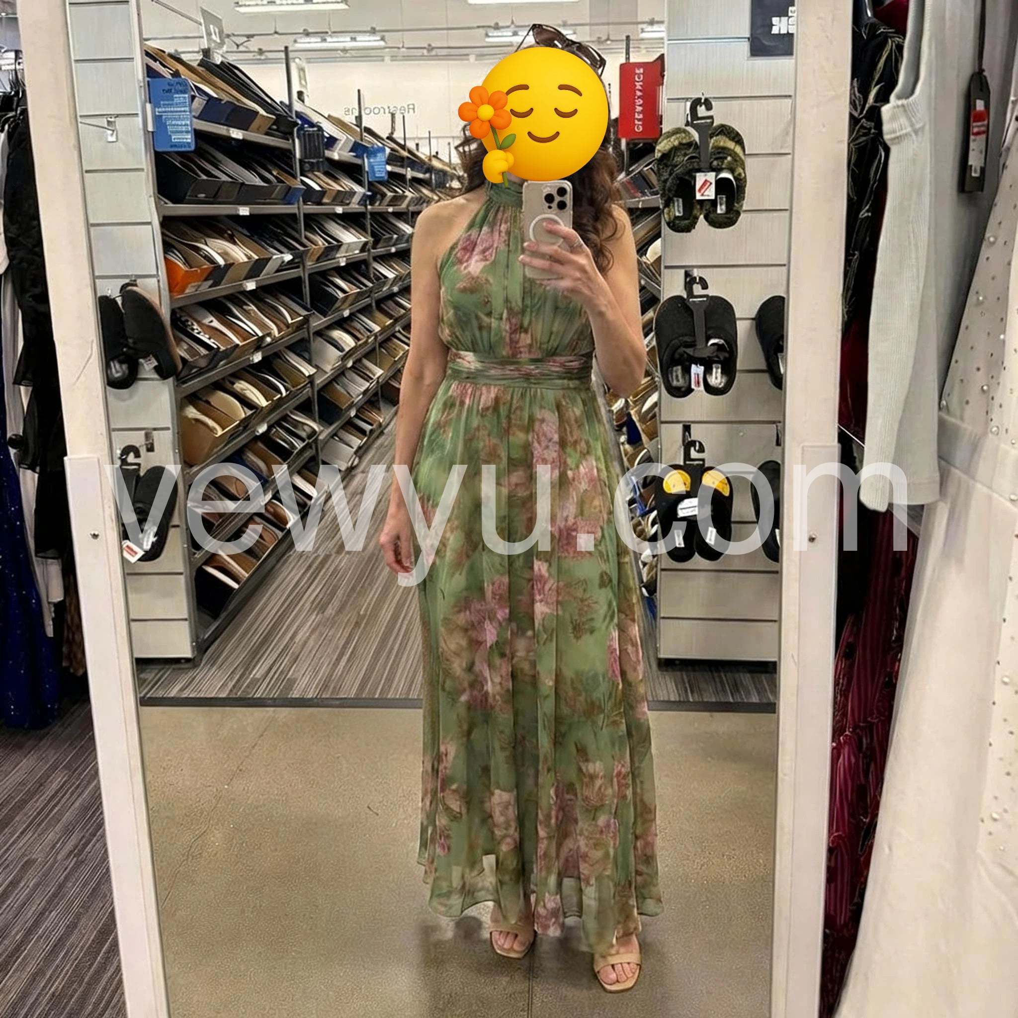 The material is so lightweight and flowy, making it perfect for summer events. The green and pink combination is stunning. It falls beautifully and the cinched waist gives a great shape.