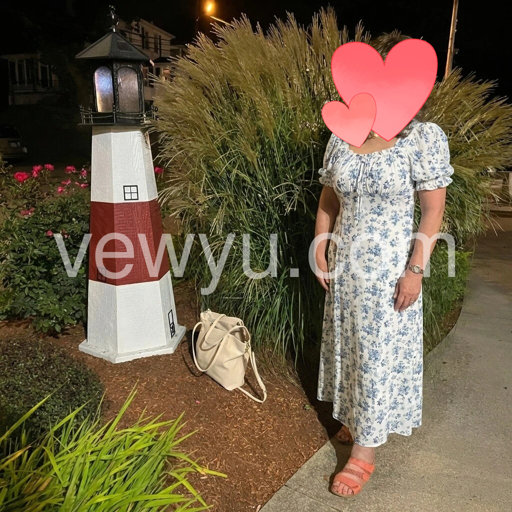 This dress is so pretty! The blue floral print is delicate and looks exactly like the photos. The puff sleeves are cute and make it feel more special. The fabric hangs nicely and the length is perfect for a comfortable midi fit. Overall, it’s well-made, fits well, and is a great purchase.