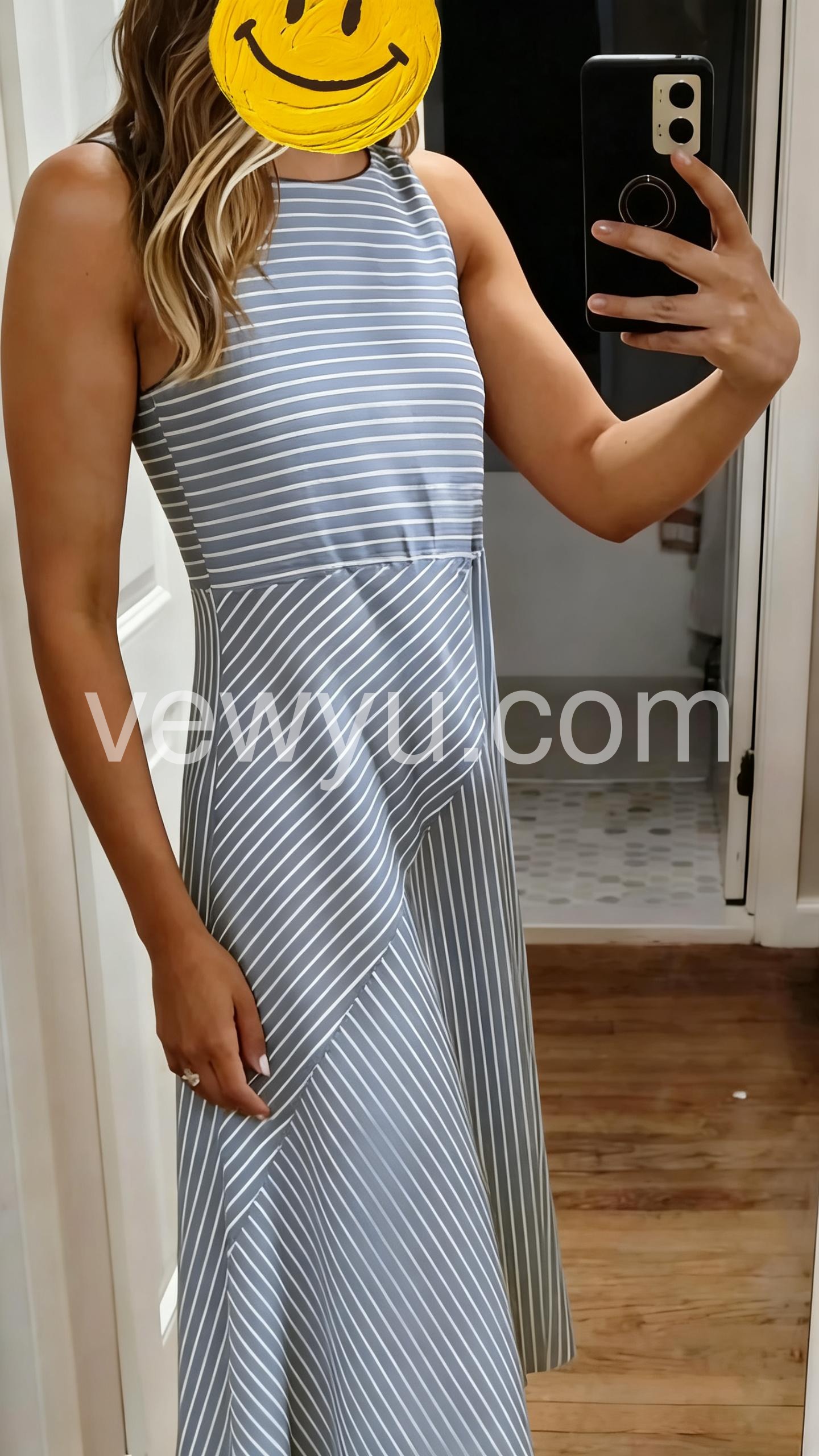 This sleeveless midi dress features a stylish blue and white striped pattern. The asymmetrical hem adds a contemporary touch. Fitted waist enhances the silhouette. Lightweight fabric perfect for summer or resort wear. Ideal for casual outings or daytime events.