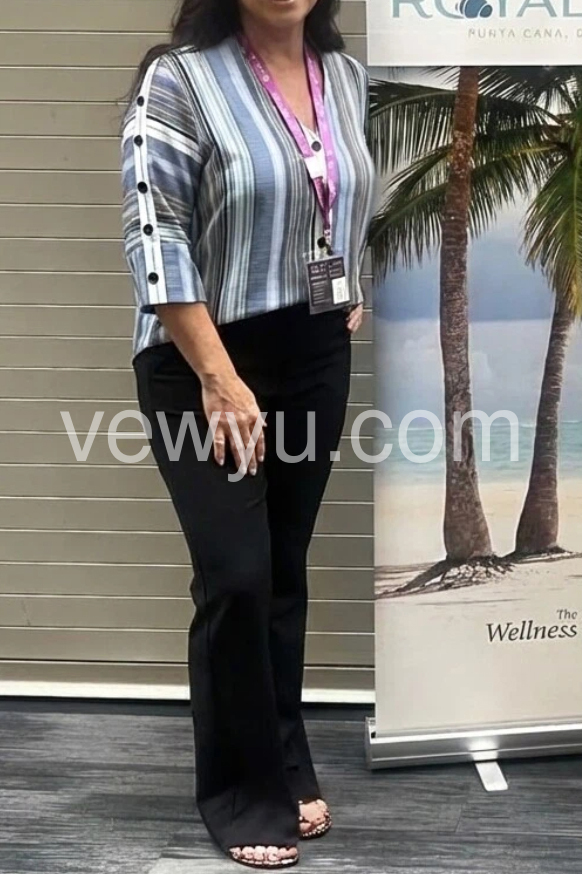 This V-neck top features vertical stripes in shades of blue, gray, and white. Front button closure and rolled sleeves with decorative side buttons. Lightweight fabric perfect for everyday wear. Relaxed fit with a modern touch. Ideal for pairing with jeans or shorts.