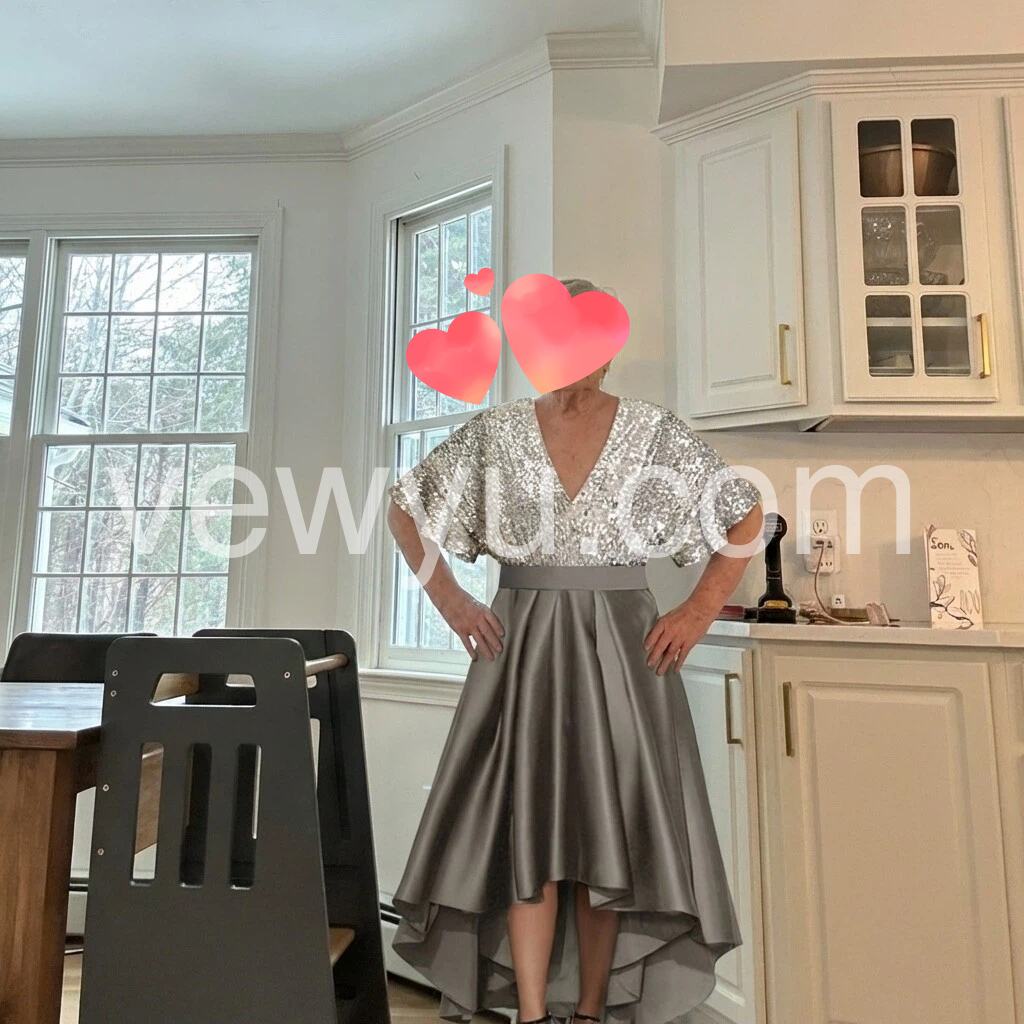 I absolutely love this dress! The silver sequins are gorgeous and really catch the light, and the V-neck looks so flattering. The skirt has a beautiful flowing shape and it feels comfortable to wear. I wore it for a special event and got so many compliments—looks exactly like the photos. Great quality!