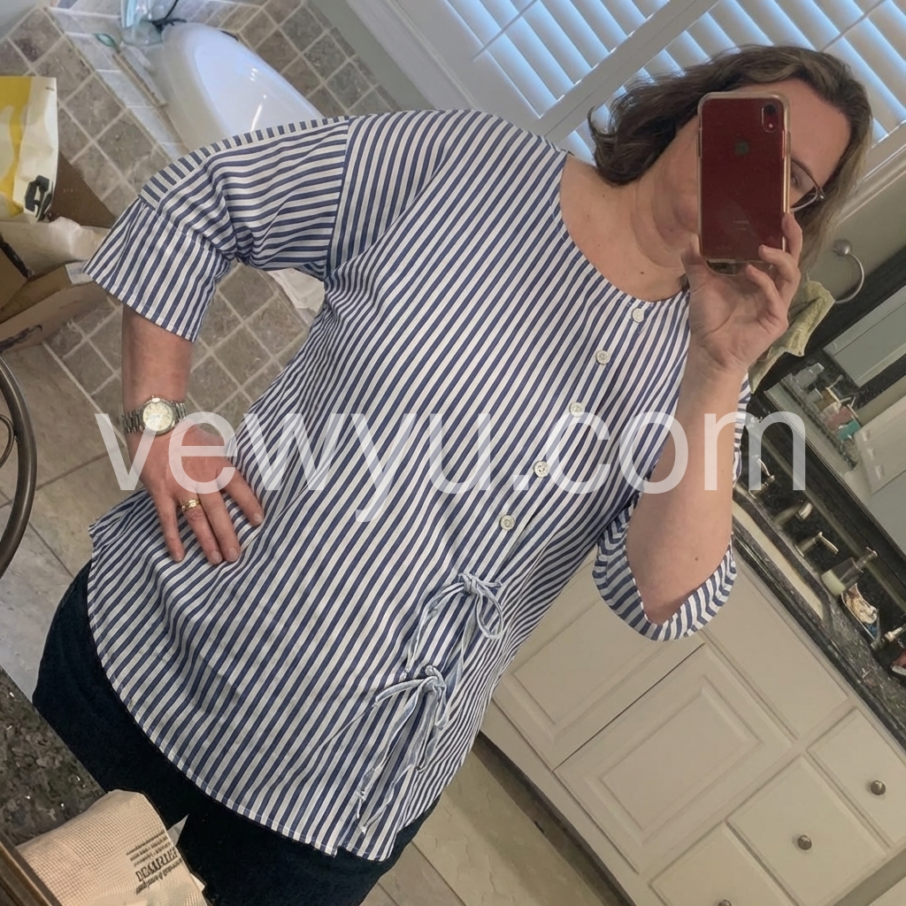 I absolutely adore the tie and button details. It takes a classic striped shirt and makes it trendy. I will definitely be looking to buy more colors if available.