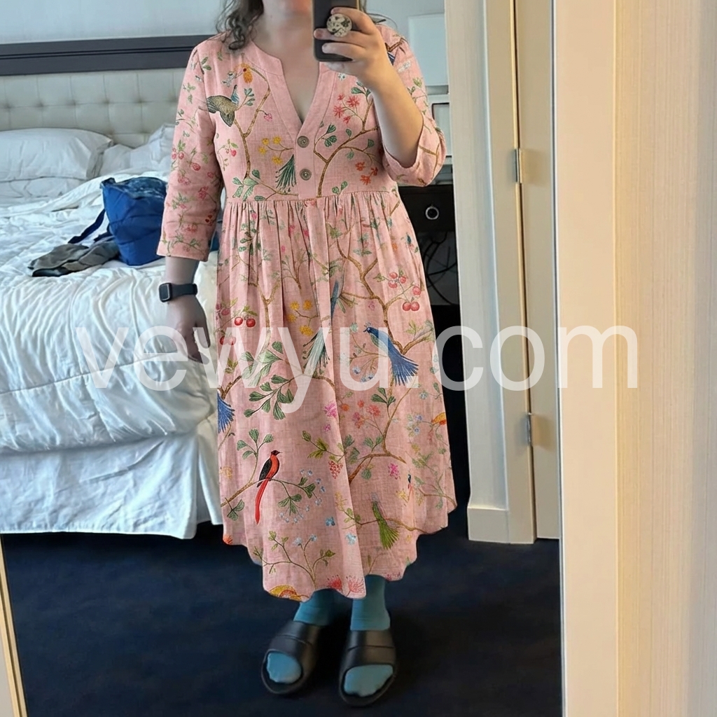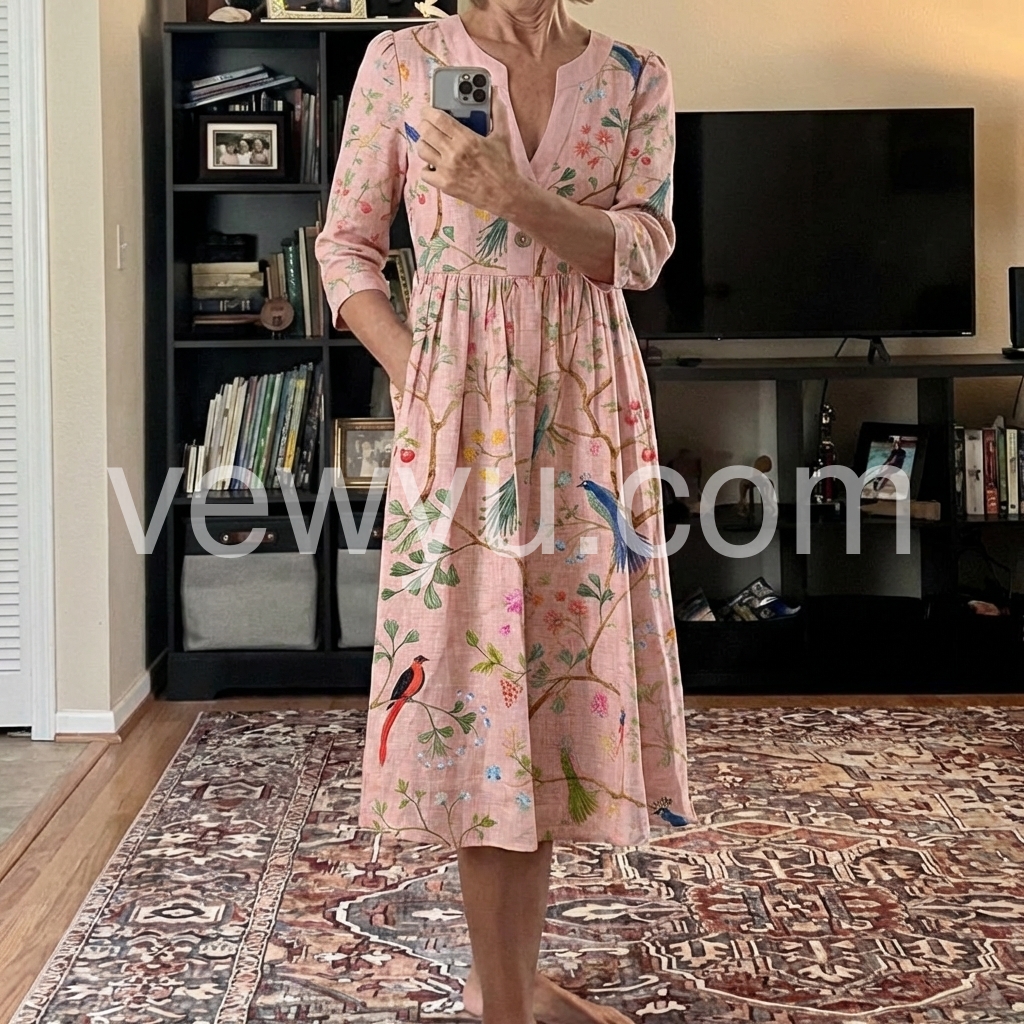 This three-quarter sleeve dress features a soft pink base with colorful birds and floral patterns. The V-neck and button front add vintage appeal. Side pockets offer comfort and convenience. Lightweight fabric perfect for spring and summer. Ideal for casual outings or garden parties.
