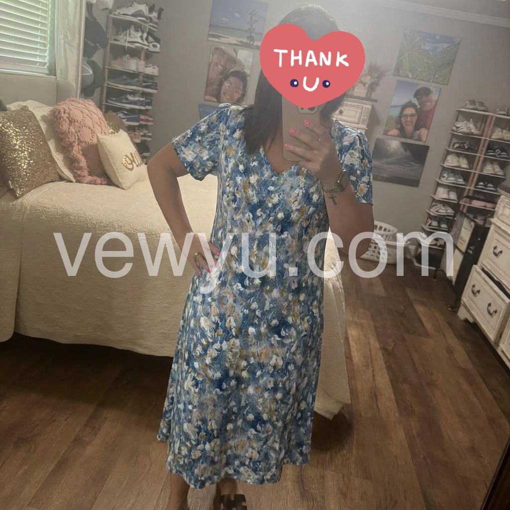 Absolutely love this dress! The blue and grey floral pattern is gorgeous in person. It has a beautiful flow to it and the material feels very light and breathable. Perfect for my upcoming beach vacation.