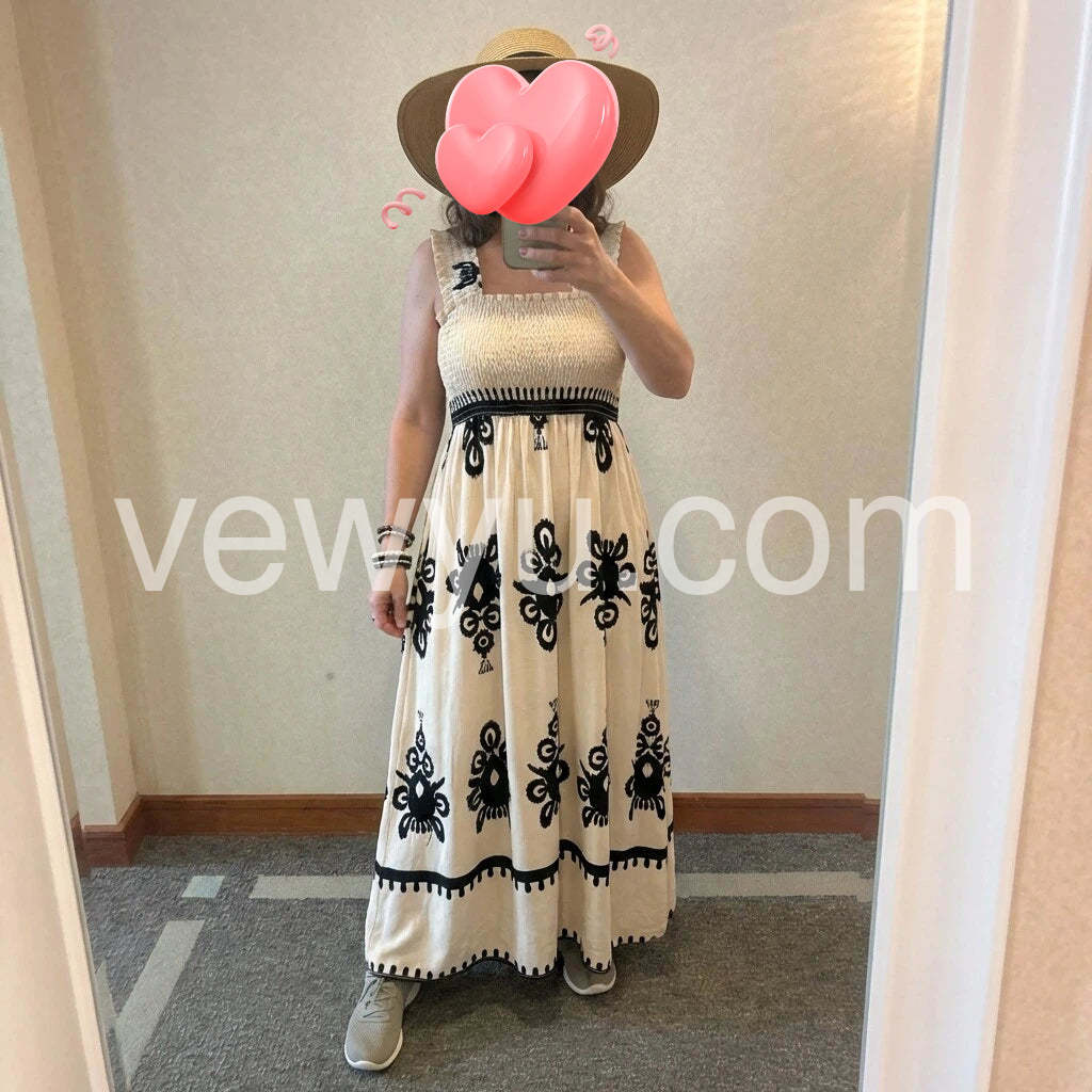 Gorgeous dress with beautiful detailing. The black embroidery stands out nicely against the cream background, and the smocked top provides a secure, comfortable fit. The length is perfect for both everyday wear and special occasions. Packaging was neat and delivery was quick.