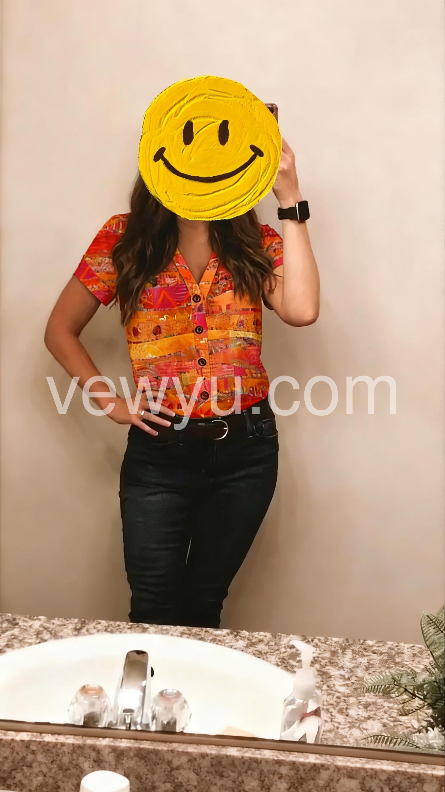 This short-sleeve button-up blouse features a lively orange and pink abstract pattern. The V-neck design adds a touch of elegance. Lightweight fabric for comfort and breathability. Perfect for making a statement in casual or boho outfits. Pair with jeans or trousers for effortless style.