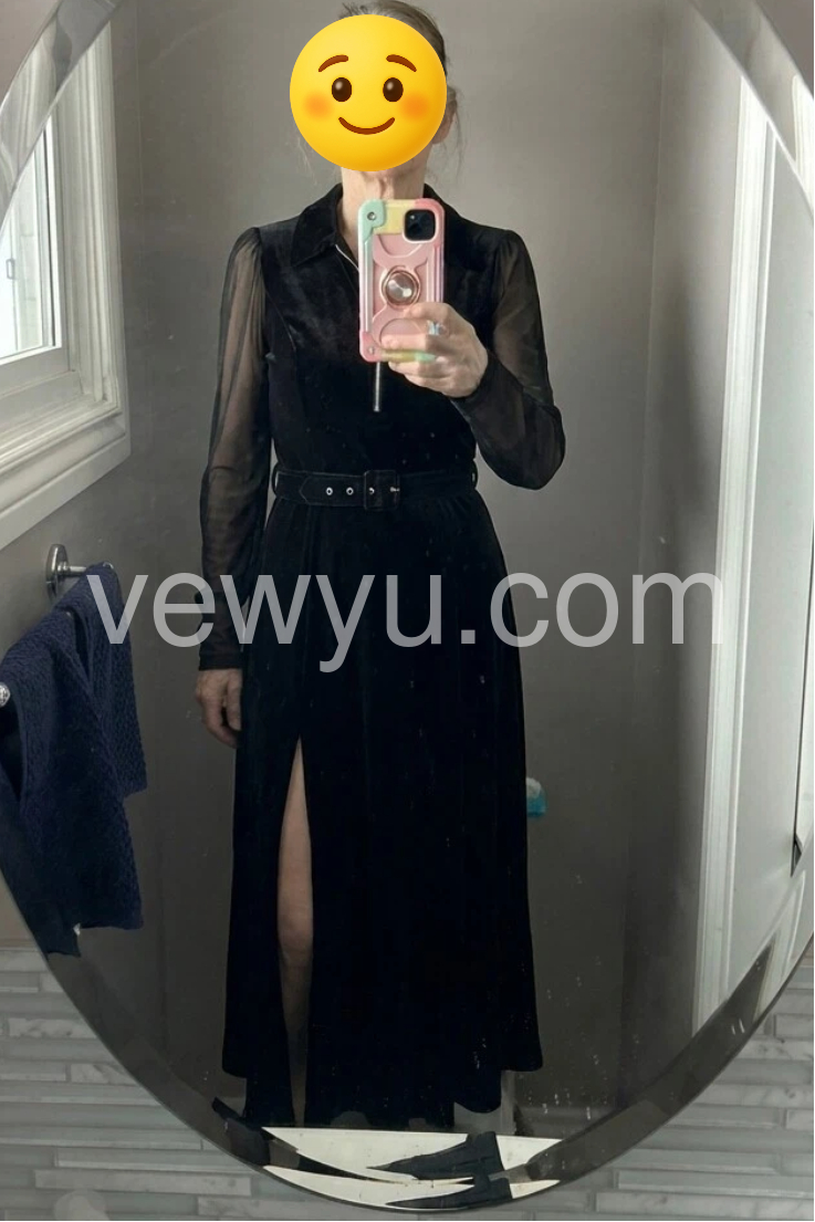 I absolutely love this dress! The black color is gorgeous and the fit is very flattering, especially with the waist belt. The front zipper/V-neck detail gives it a stylish look, and the long sleeves make it feel perfect for dressing up. The fabric hangs beautifully and the skirt has a nice flow. It looks just like the photos and feels high quality.