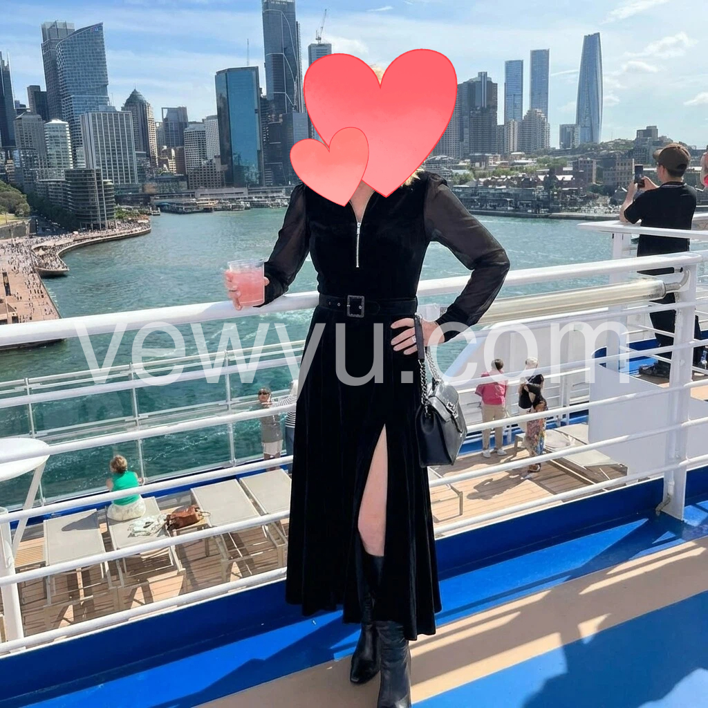 This is a beautiful black maxi dress. The zip neckline and the waist belt create such a flattering shape, and the length is perfect with boots. It feels comfortable while still looking very polished and elegant. I wore it on a cruise and got compliments right away.