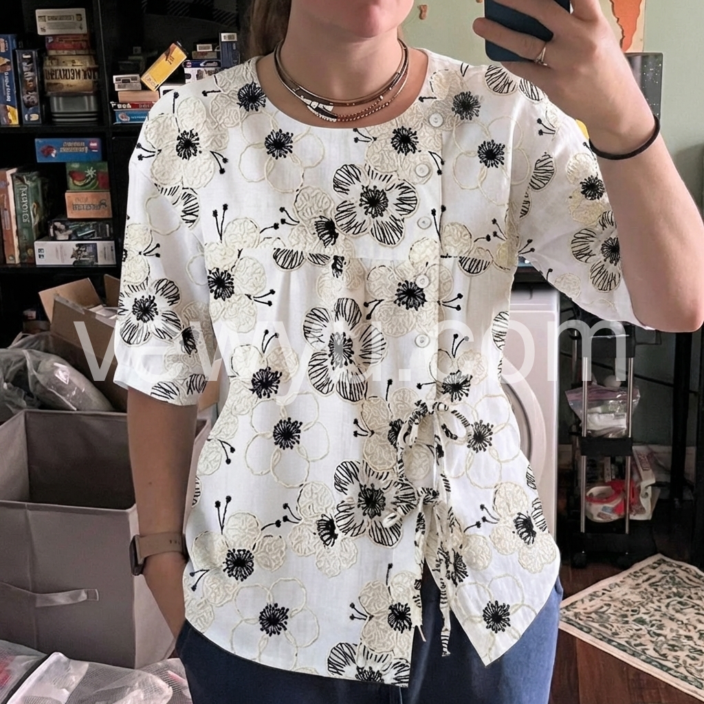 I absolutely love this top! The floral pattern is beautiful and looks exactly like the picture. The material is lightweight and breathable, making it perfect for summer days. It fits true to size and the little tie waist gives it a very flattering shape.